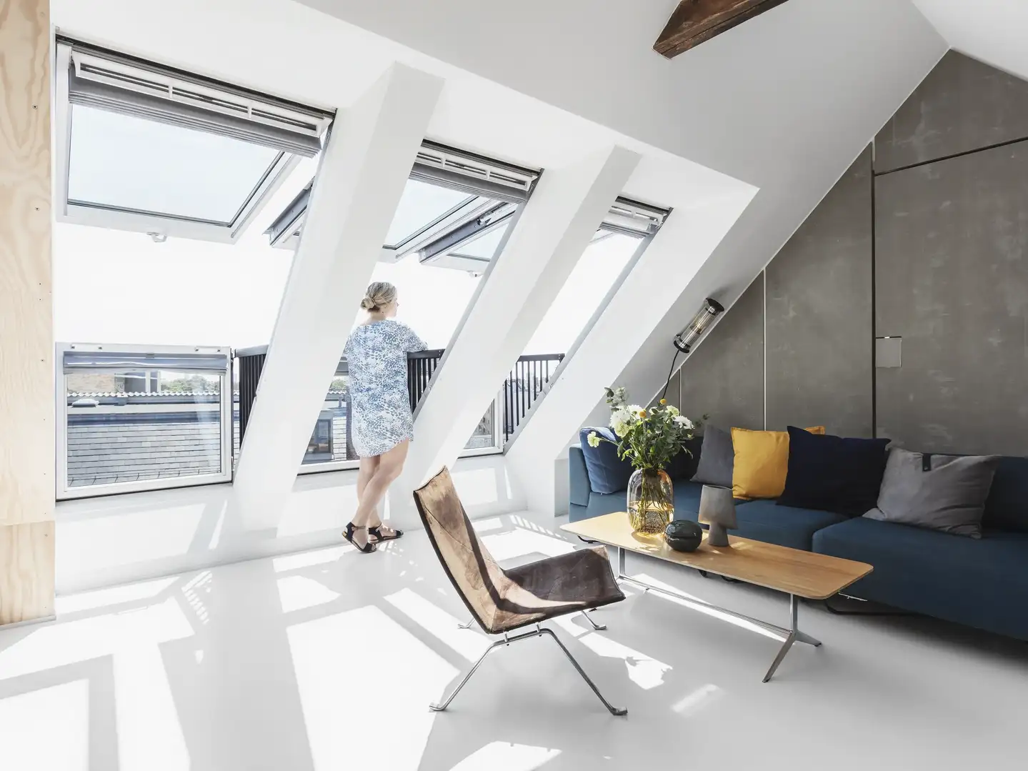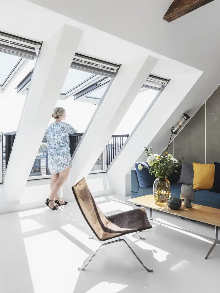 A contrario, les fenêtres de toit sont une très bonne solution pour apporter une lumière douce et chaude dans la pièce à vivre, sans avoir besoin de demander d’autorisations. Grâce à leur positionnement zénithal elles laissent largement entrer la lumière du jour sans que les meubles n’y fassent obstacle, tout en rendant la pièce modulable et évolutive au fil du temps. Si la pièce s’y prête, n’hésitez pas à en installer plusieurs à la façon d’une verrière, par exemple, une configuration qui laissera entrer énormément de lumière.