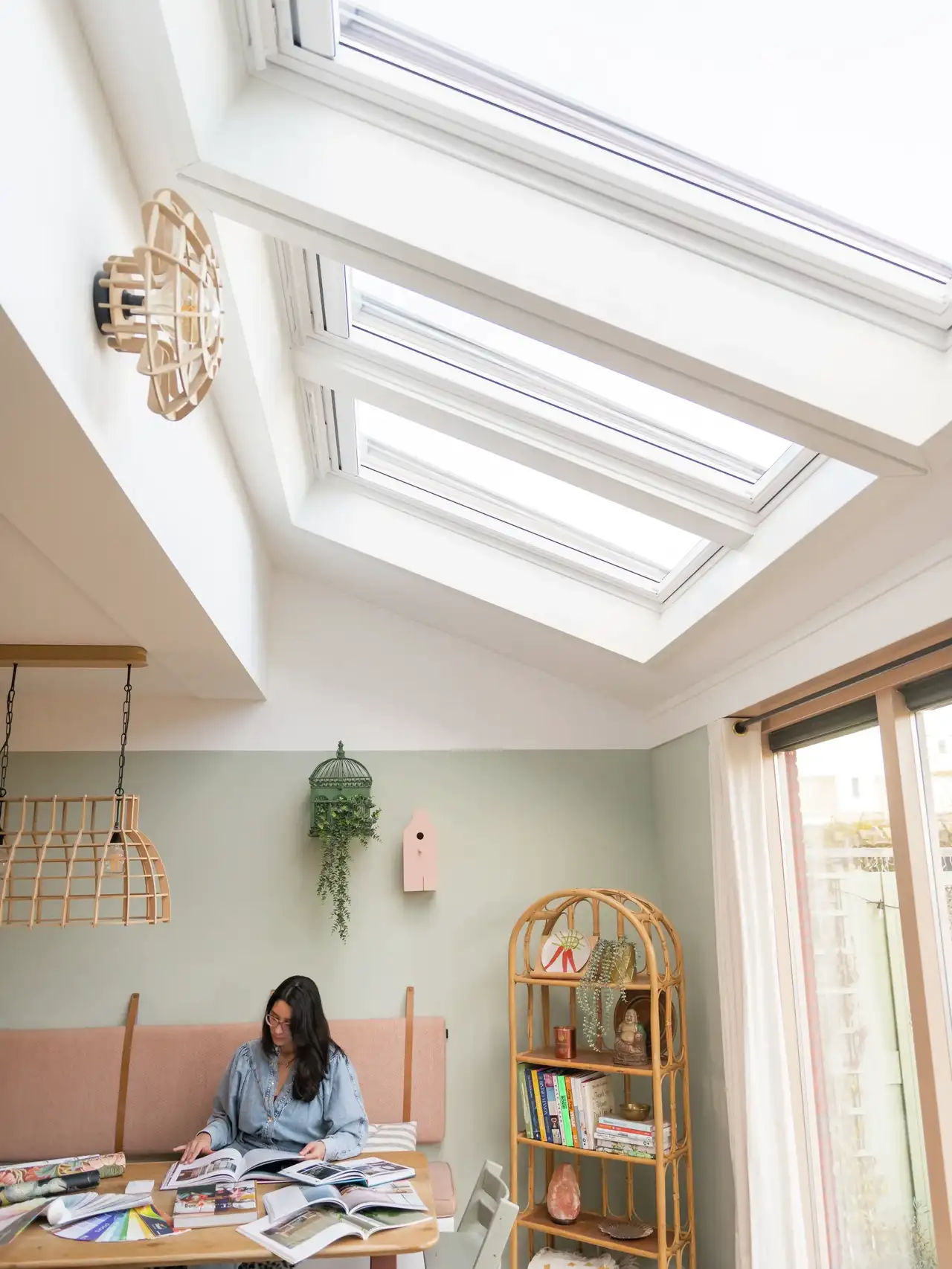 Les fenêtres de toit et autres verrières jouent un rôle essentiel pour maximiser cet apport en lumière naturelle. Elles permettent d’inonder l’espace d’une lumière zénithale, douce et constante tout au long de la journée, créant une ambiance lumineuse et apaisante. Cette lumière venue d’en haut donne une sensation d'ouverture et accentue le caractère aérien du style bohème, tout en renforçant la connexion avec la nature grâce à une vue dégagée sur le ciel.