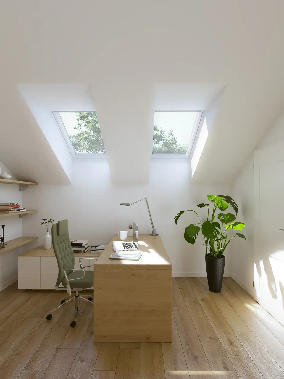 Le système VELUX Active contrôle automatiquement les fenêtres difficiles d’accès de ce bureau sous les toits.