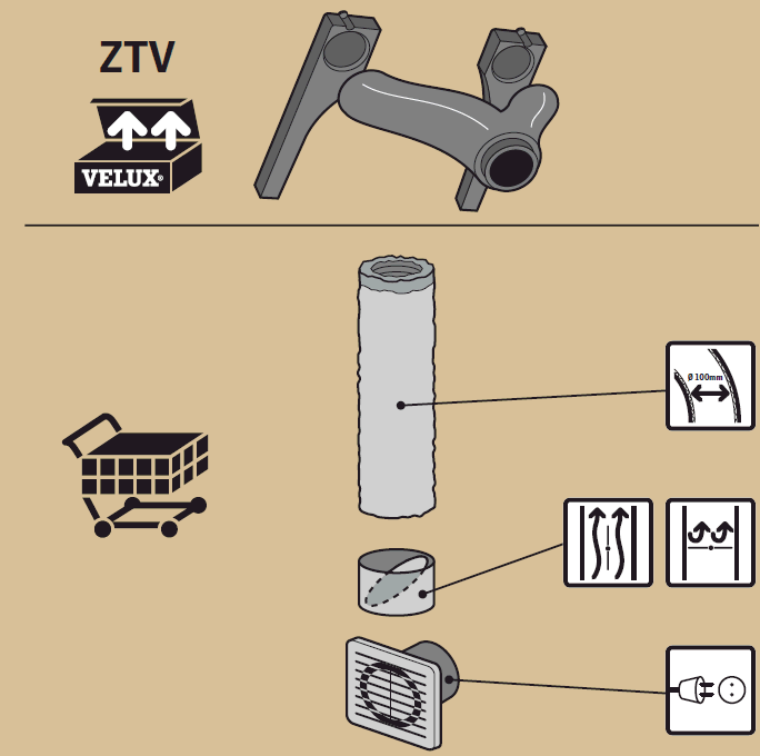 Cependant, il est possible d'ajouter un collecteur d' extraction (ZTV) qui s'implante dans la partie externe (en toiture) du Sun tunnel de type TWF/TWR. Ce collecteur doit ensuite être raccordé à un extracteur au travers d'une gaine (éléments non fournis dans le kit). Le moteur d'extraction est ensuite disposé au sein du rampant intérieur, ce qui facilite le renouvellement de l'air intérieur de la pièce et donc aussi de l'humidité.